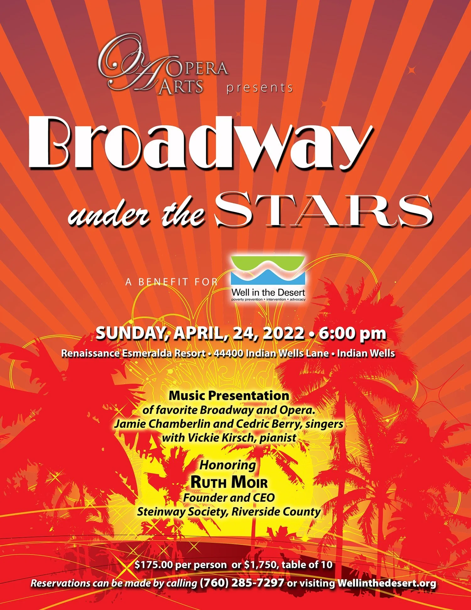 AR - Yes! Please join us on Sunday, April 24th at the Renaissance Esmerelda in Indian Wells for our Broadway under the Stars event featuring performances by the incomparable Jamie Chamberlin and Cedric Berry! (see flyer for more details, book tickets here)